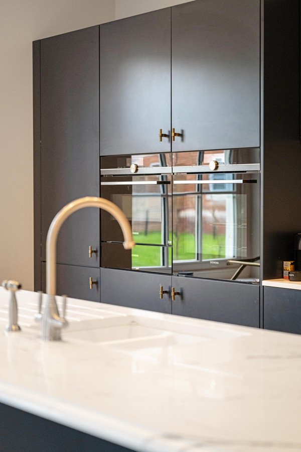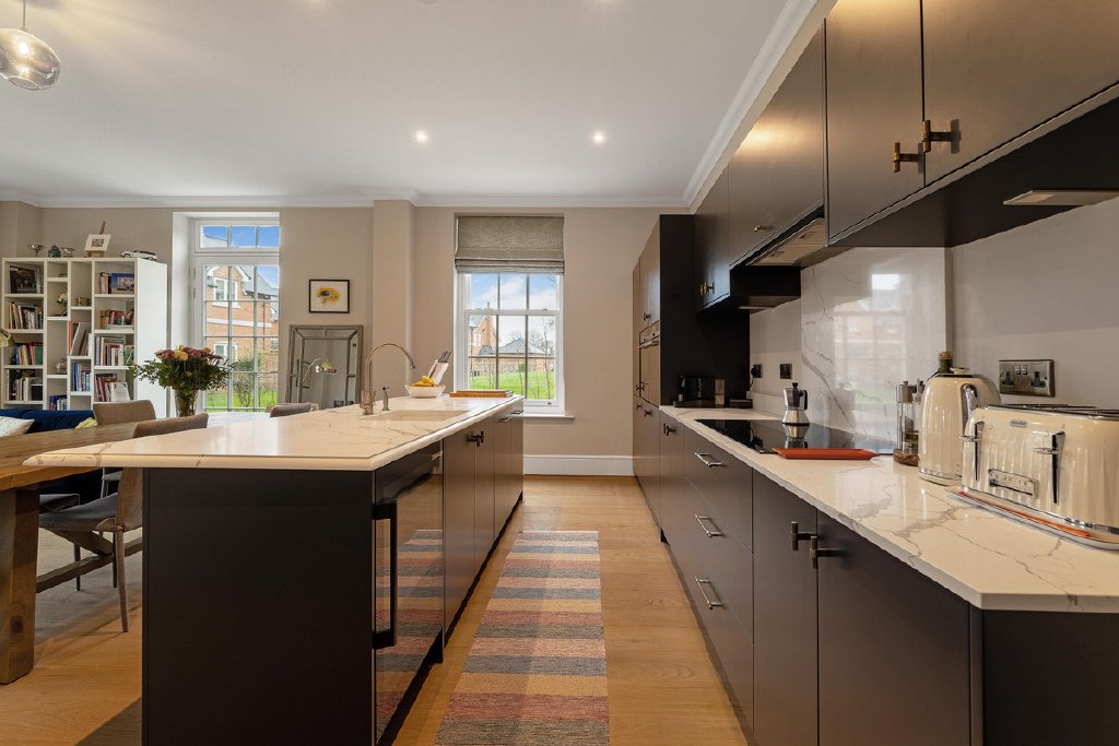 This is a space designed not just for living, but for hosting, unwinding, and reconnecting. At its heart, the kitchen is both sculptural and practical — bespoke cabinetry paired with quartz worktops and a generous island that naturally becomes the social anchor of the home. Integrated appliances ensure clean lines and seamless functionality, while a separate utility room quietly supports the day-to-day.