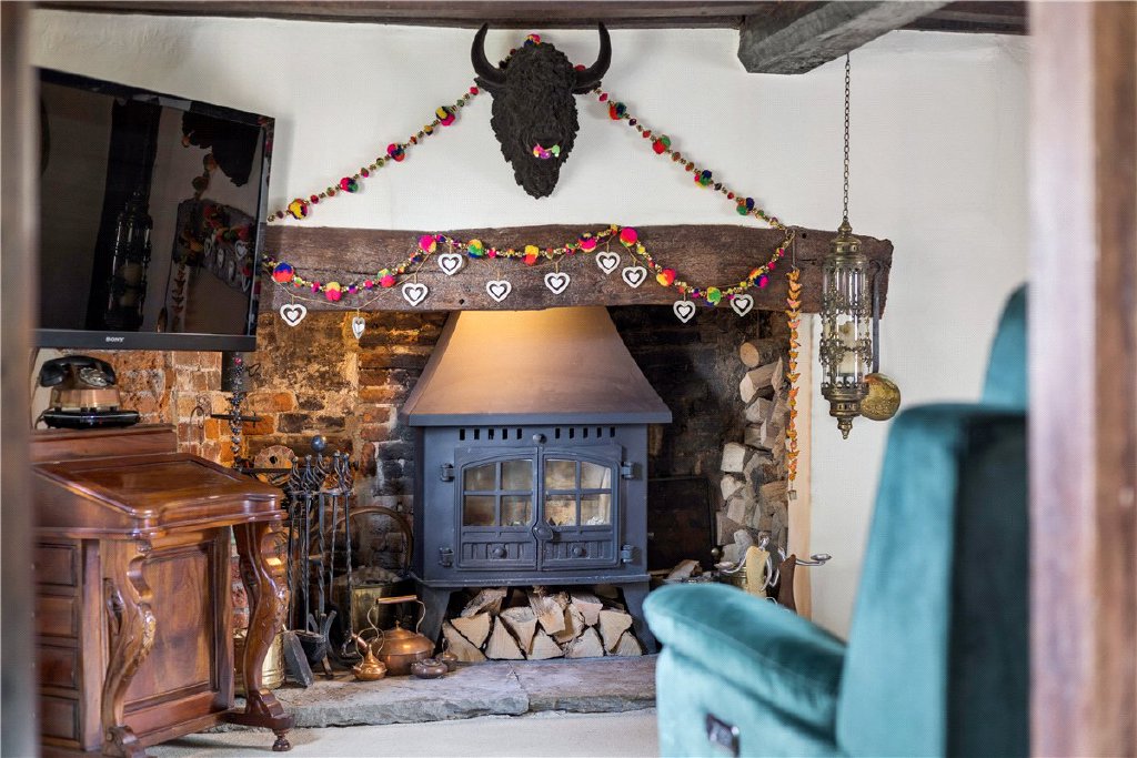 A welcoming porch opens into the entrance hall, laid with brick flooring, which leads through to a spacious dual-aspect sitting room featuring a generous inglenook fireplace with a woodburning stove. A striking oak door leads into the characterful dining room, a delightful area with panelled walls, exposed beams, and an open fireplace, which flows naturally into the kitchen.