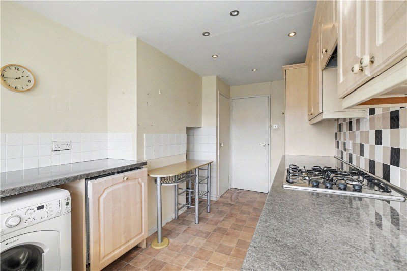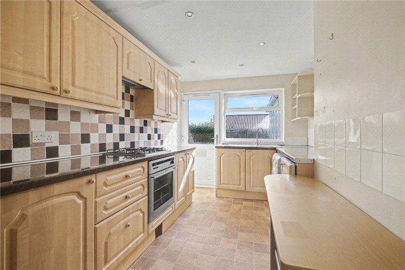 The kitchen is fitted with a range of base and wall units, a built-in oven and gas hob, along with space for additional appliances. Whilst functional, it offers clear scope for modernisation and reconfiguration if desired.