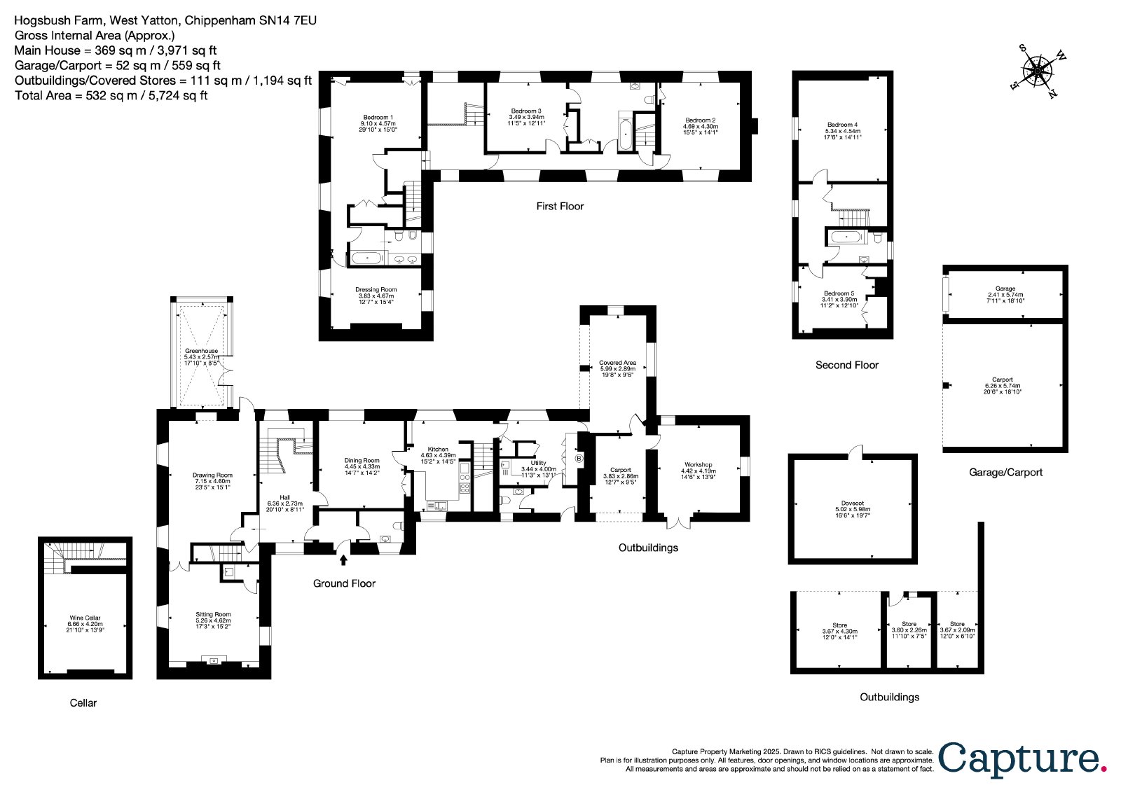 Principal Bedroom with en suite bathroom and dressing room/study • Four further bedrooms • Two bathrooms • Cellar and wine store