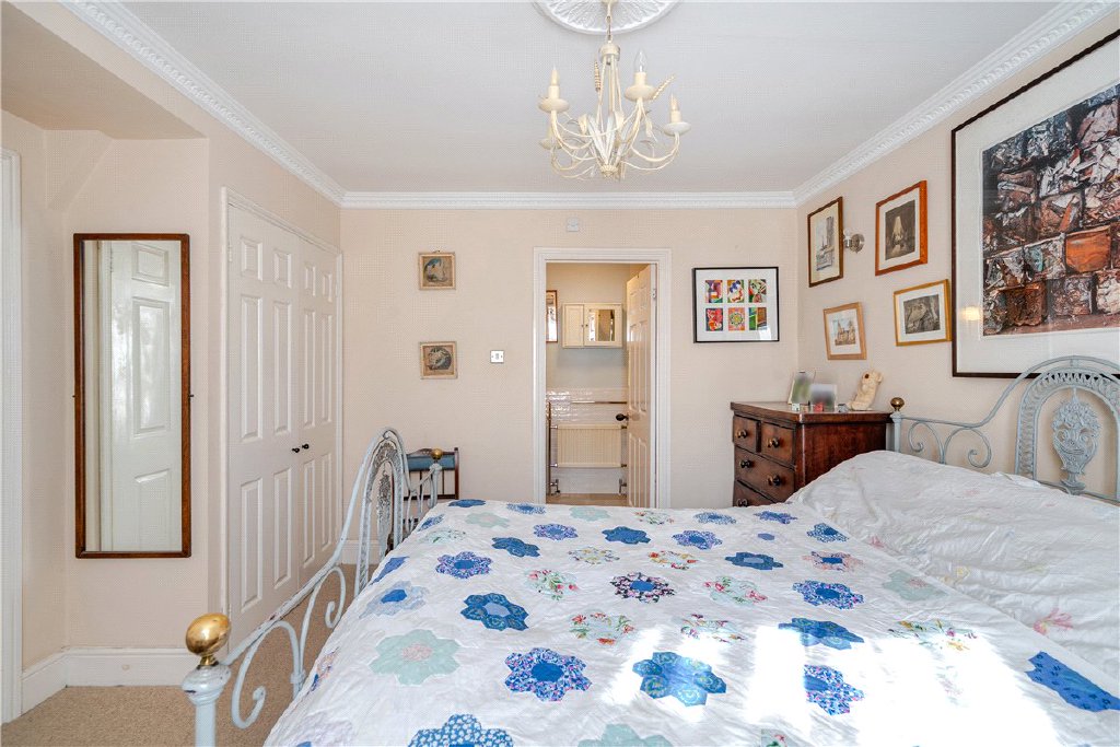 The master bedroom sits at the front of the property and features original shutters, fitted wardrobes and a smart en suite shower room.