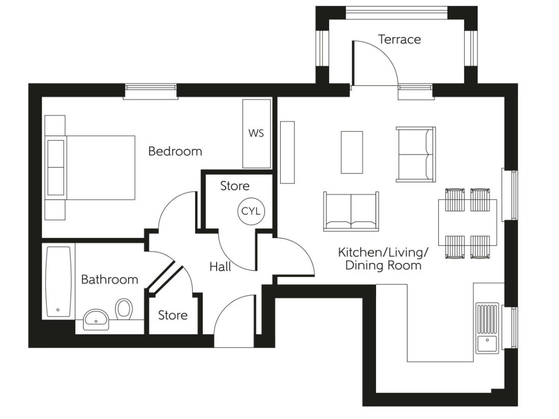 The apartment offers open-plan living, combining a high specification kitchen with integrated appliances, a dining area, and a comfortable living space that opens onto a private balcony, an ideal spot to add some outdoor furniture.