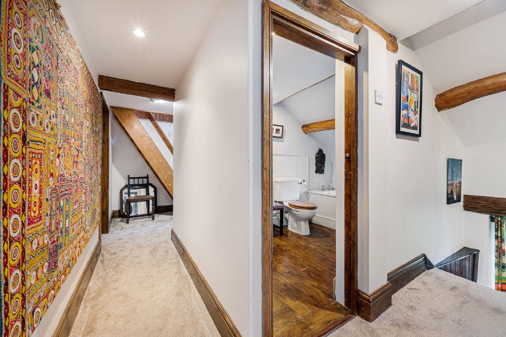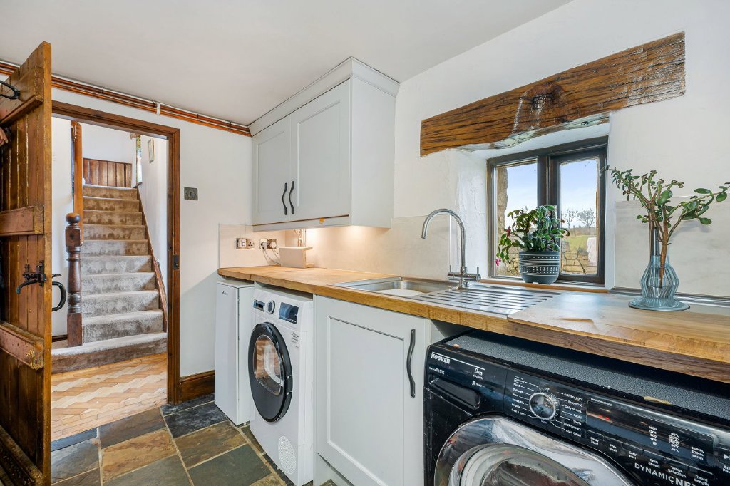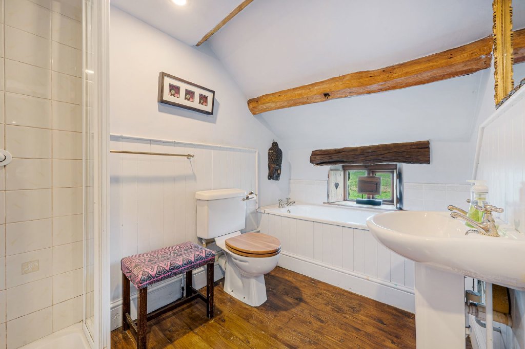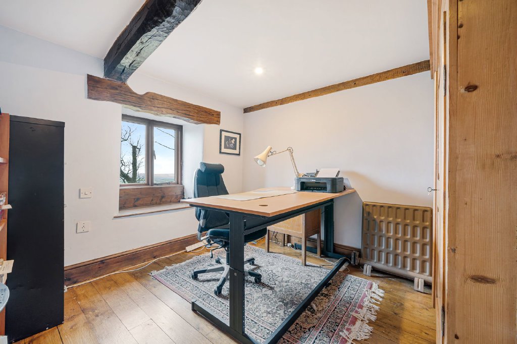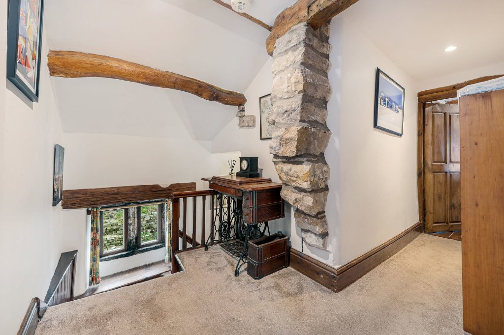 Internally there are exposed beams, stone mullion window surrounds, window seats, two old fireplaces (now fitted with solid fuel stoves), original panel doors and a feature section of the wattle and daub internal wall construction. The farmhouse originally had a series of workers’ cottages attached, thought to have housed the employees of the adjacent hat factory which occupied the detached stone outbuilding; the hat factory was located here to take advantage of the abundant supply of wool and rabbit fur. It’s now used for storage.