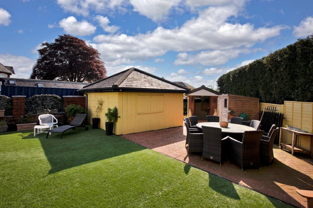 Beyond the parking area, the rear garden is laid predominantly to artificial lawn for low maintenance and offers a generous, level space ideal for relaxation, recreation and entertaining. A paved patio provides an excellent spot for outdoor dining and seating, enjoying a sunny aspect and a good degree of privacy.