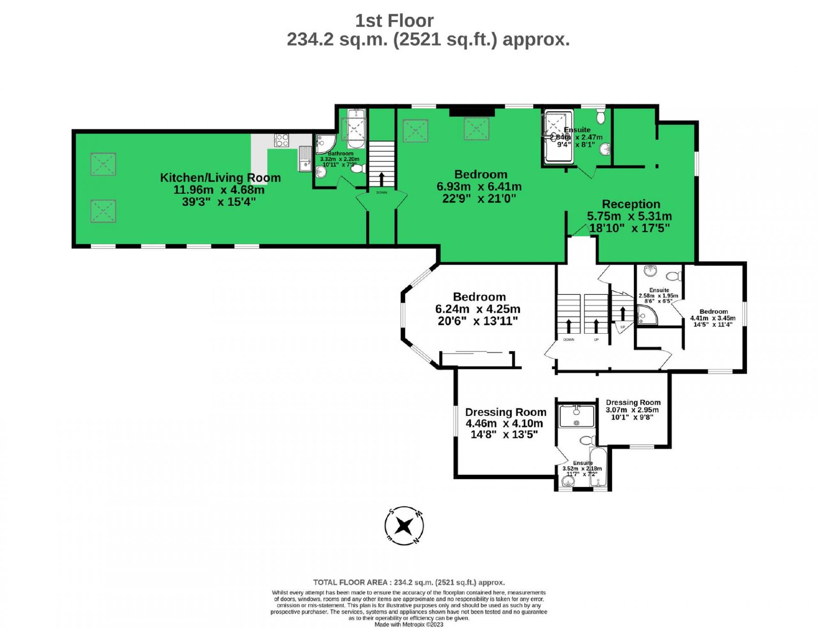 The first floor continues the theme of space and adaptability, hosting a large studio apartment, complete with its own living area and en-suite facilities, alongside further substantial bedrooms. All bedrooms benefit from en-suite shower rooms and several from dressing rooms, creating private, well-appointed suites.